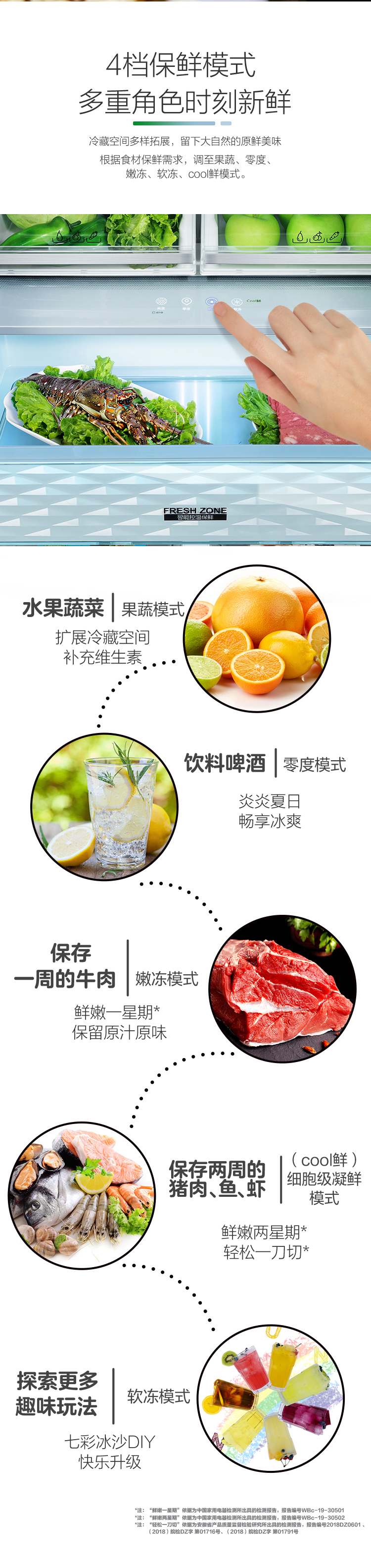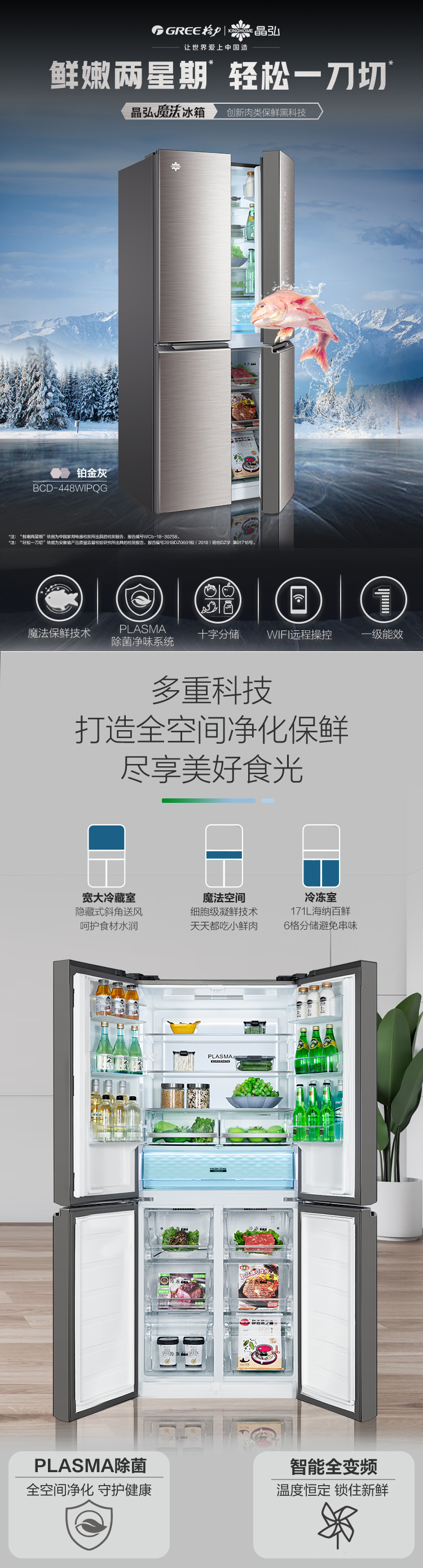 搭載-5℃嫩凍凝鮮科技,鮮嫩兩星期,輕松一刀切。Plasma等離子除菌凈味,除菌保鮮,長久新鮮。4檔保鮮模式,多重角色時(shí)刻新鮮。